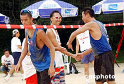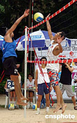 由香港排球總會、康樂及文化事務(wù)署及Bolle合辦的“香港沙灘排球錦標(biāo)賽2004”于8月8日在黃金海岸舉行,進(jìn)入男子組總決賽的選手周國偉、吳景鴻戰(zhàn)勝對手獲得冠軍。者:洪少葵