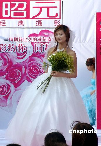 8月8日,一些婚紗影樓公司在鄭州市二七廣場(chǎng)附近大搞促銷活動(dòng),迎接十一前后的結(jié)婚高峰的到來。 作者:馬健