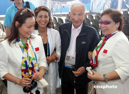 當(dāng)?shù)貢r(shí)間八點(diǎn)五十分剛過,人們都把注意力集中到了中國(guó)代表團(tuán)身上。不過就在這時(shí)候,年逾古稀的薩馬蘭奇突然來(lái)到現(xiàn)場(chǎng),頓時(shí)引起了場(chǎng)內(nèi)記者的包圍訪問。薩馬蘭奇顯得精神煥發(fā),微笑著走上前與中國(guó)代表團(tuán)的官員和選手們握手問候,并表達(dá)了對(duì)中國(guó)代表團(tuán)的祝福。中國(guó)代表團(tuán)的成員們也起立鼓掌,歡迎這位中國(guó)老朋友的到訪,并祝愿他身體健康。