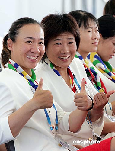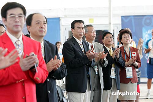 當(dāng)?shù)貢r(shí)間八月九日上午,參加雅典奧運(yùn)會(huì)的中國(guó)體育代表團(tuán)在雅典奧運(yùn)選手村舉行升旗儀式。中新社記者:毛建軍