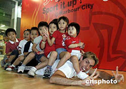 在8月世界體壇盛事,全城矚目之際,香港海港城特別聯(lián)同F(xiàn)itness First健身會(huì)所,向顧客提供多項(xiàng)在海港城SportX舉行的午間及晚間團(tuán)體跳舞課程,讓顧客有機(jī)會(huì)親身參與,強(qiáng)身健體活動(dòng)。圖為9日教練現(xiàn)場(chǎng)與小朋友玩游戲。作者:洪少葵