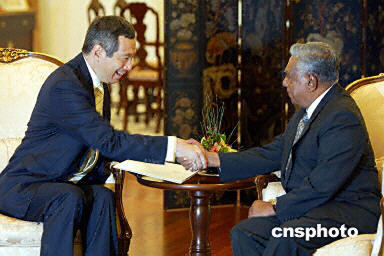 8月10日,新加坡總理吳作棟(左)在總統(tǒng)府正式向新加坡總統(tǒng)納丹遞交辭呈,從而為副總理李顯龍在近日正式接任總理一職鋪平了道路。