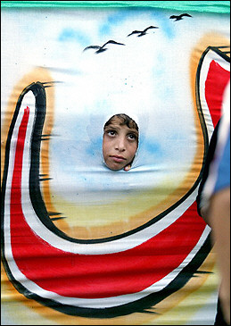 中新網(wǎng)8月11日電 據(jù)法新社報(bào)道,在加沙地帶,巴勒斯坦“伊斯蘭圣戰(zhàn)”組織的武裝分子正在舉行反抗以色列的集會(huì)活動(dòng)。圖為一名巴勒斯坦男孩正從一面旗幟的破洞處探出腦袋,伸首觀望。(固山)