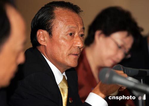 中國(guó)奧運(yùn)代表團(tuán)當(dāng)?shù)貢r(shí)間八月十一日在希臘雅典奧運(yùn)會(huì)主新聞中心舉行新聞發(fā)布會(huì),代表團(tuán)副團(tuán)長(zhǎng)李富榮(中)等回答記者提問(wèn)。中新社記者:任晨鳴