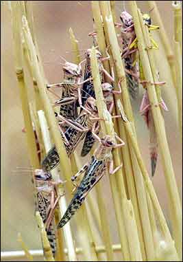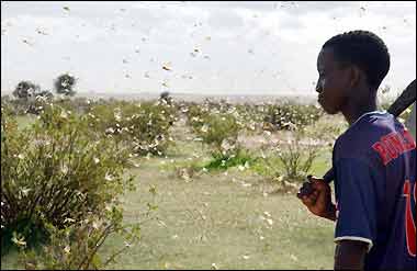 目前這一地區(qū)現(xiàn)在面臨著15年來(lái)最為嚴(yán)重的一次蝗災(zāi),大批的沙漠蝗蟲正從西北非侵襲毛利塔尼亞,馬里以及尼日利亞,在這一地區(qū),很多都是依靠農(nóng)業(yè)生活的人;葹(zāi)爆發(fā)時(shí),一群群的蝗蟲鋪天蓋地,烏云蔽日般東奔西撞,它們所到之處,各種綠色植物均遭暴殄,慘不忍睹。1988年,非洲的塞內(nèi)加爾和毛里塔尼亞境內(nèi),發(fā)生了數(shù)十年罕見的蝗災(zāi),僅一群蝗蟲就可達(dá)1000億只以上。