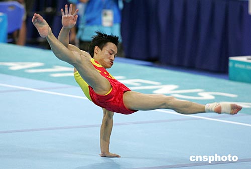中國男子體操隊于當(dāng)?shù)貢r間八月十一日晚在雅典奧運體操比賽館與德國、日本、烏克蘭隊進(jìn)行集體合練,圖為楊威在自由體操訓(xùn)練中。中新社記者:毛建軍