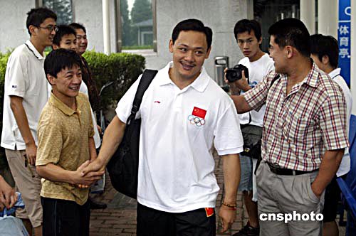 八月十二日,中國舉重隊著名選手占旭剛(中)在中國國家體育總局訓(xùn)練局與隊友們告別奔赴雅典,這是中國舉重隊第二批隊員出征雅典奧運會。中新社記者:盛佳鵬
