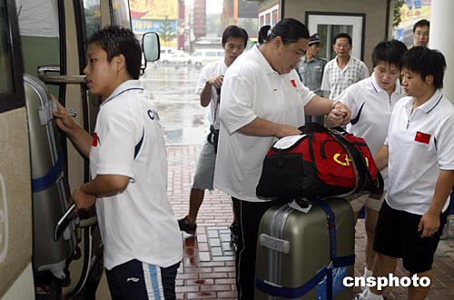 8月12日,中國舉重隊(duì)的重量級(jí)選手唐功紅在中國國家體育總局訓(xùn)練局收拾行囊出征雅典奧運(yùn)會(huì)。中國舉重隊(duì)第二批隊(duì)員是日出發(fā)雅典。中新社記者:盛佳鵬