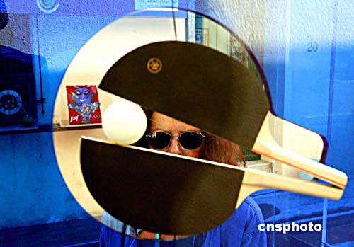 奧運(yùn)開幕前,在雅典市中心的奧運(yùn)主題一條街上,一名游客正仔細(xì)觀看作為藝術(shù)品陳列的乒乓球拍。中新社記者:王瑤