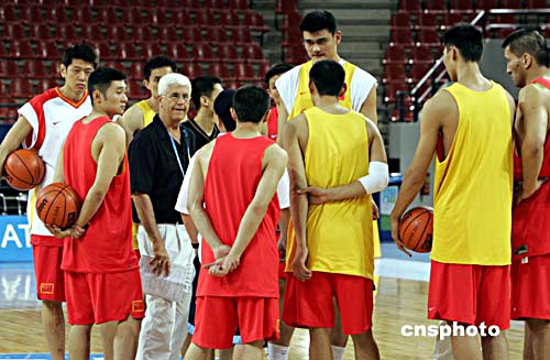 將要在開幕式上擔(dān)任中國(guó)代表團(tuán)旗手的姚明在訓(xùn)練中與主教練交流。