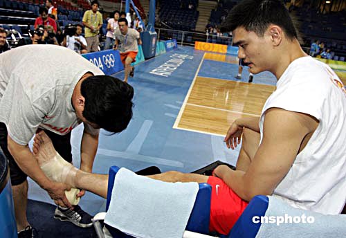 圖為將要在開幕式上擔(dān)任中國(guó)奧運(yùn)代表團(tuán)旗手的姚明(右)在訓(xùn)練前接受隊(duì)醫(yī)對(duì)其進(jìn)行包裹保護(hù)。
