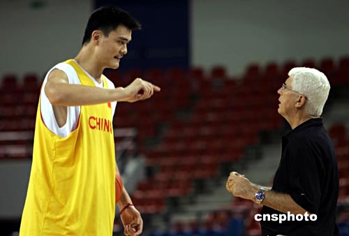 當滿頭銀發(fā)的中國男籃主帥哈里斯姍姍出現(xiàn)在訓練館內(nèi)時,隊員們開始集合,此時比預定的訓練時間晚了半個多小時。在例行的熱身活動后,中國男籃分成黃、紅兩隊進行了幾套戰(zhàn)術(shù)的演練。由姚明、易建聯(lián)、李楠、劉煒、朱芳雨等組成的黃隊無疑是中國男籃的主力陣容。