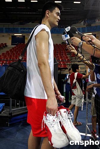 當(dāng)?shù)貢r(shí)間十二日,雅典風(fēng)和日麗,但因?yàn)樯泶┦?hào)球衣的中國(guó)球星姚明的到來(lái),赫利尼科奧林匹克中心籃球館成為“臺(tái)風(fēng)”中心。