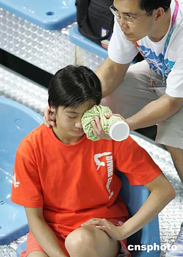 中國跳水女選手勞麗詩當?shù)貢r間八月十二日在雅典訓練前,由隊醫(yī)幫助用冰袋治療眼睛疾患。中新社記者:毛建軍
