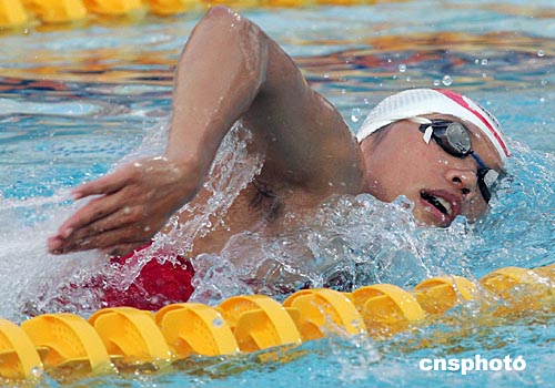 中國(guó)游泳名將齊暉當(dāng)?shù)貢r(shí)間八月十二日晚在雅典奧運(yùn)賽場(chǎng)進(jìn)行熱身訓(xùn)練。中新社記者:毛建軍