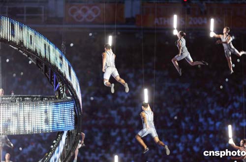 當?shù)貢r間八月十三日晚,第二十八屆奧運會在希臘雅典開幕。圖為奧運開幕式上的飛天表演。中新社記者:毛建軍