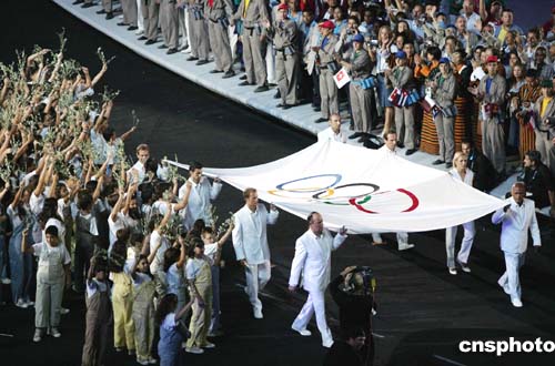當(dāng)?shù)貢r間八月十三日晚,第二十八屆奧運會在希臘雅典開幕,奧運五環(huán)旗進入開幕式會場。中新社記者:毛建軍