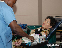 美東時間八月十四日,美國宗教團體在紐約法拉盛開展獻血活動,一百多位華人前來獻血,其中體檢合格的八十一人每人獻血500毫升。圖為在紐約、深圳、臺灣三地經(jīng)營紅木精品家具的應霞華女士(右)一早趕到臨時獻血站獻血。作者:龔文謨