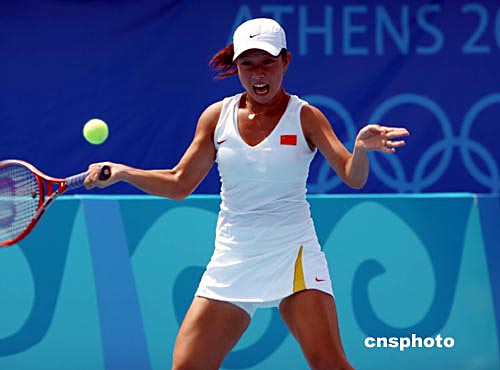 中國唯一參加雅典奧運會女子網(wǎng)球單打比賽的鄭潔,當?shù)貢r間8月15日首輪迎戰(zhàn)日本名將山杉愛,在大好局面下可惜以微弱比分失敗。中新社記者:任晨鳴
