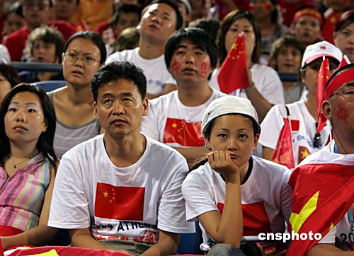 當(dāng)?shù)貢r(shí)間8月15日,中國男籃在雅典奧運(yùn)會首輪比賽中迎戰(zhàn)西班牙隊(duì),最終中國隊(duì)以大比分負(fù)于對手。圖為現(xiàn)場觀戰(zhàn)的中國球迷感到十分失望。中新社記者:任晨鳴