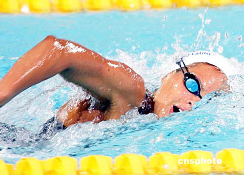 當(dāng)?shù)貢r(shí)間八月十五日晚,在雅典舉行的第二十八屆奧運(yùn)會(huì)游泳比賽中,法國選手MANAUDOU LAURE以四分零五秒三四的成績獲得女子四百米自由泳金牌。中新社記者:毛建軍