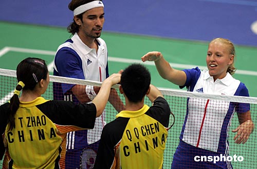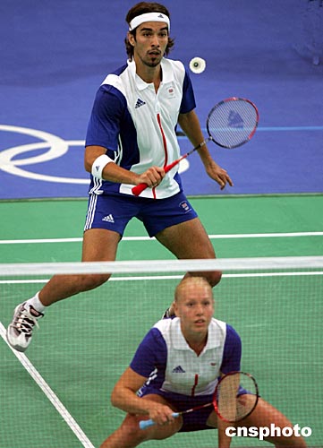 英國參加雅典奧運會羽毛球混合雙打的羅伯遜、埃姆斯,當?shù)貢r間8月16日以2比0選手戰(zhàn)勝中國選手陳其遒、趙婷婷,進入前四名。