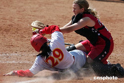 當(dāng)?shù)貢r(shí)間八月十六日,在雅典奧運(yùn)女子壘球比賽中,中國(guó)隊(duì)四比二戰(zhàn)勝加拿大隊(duì),二十九號(hào)郭佳搶壘得分。中新社記者:毛建軍