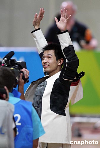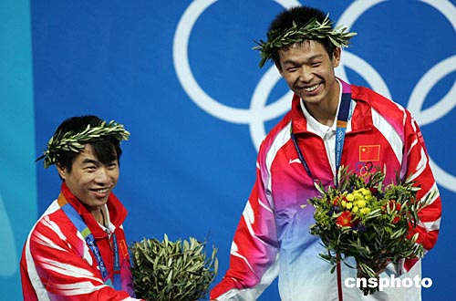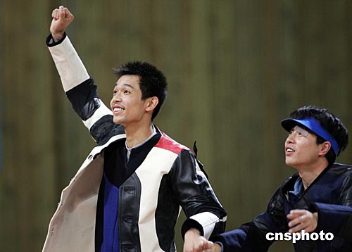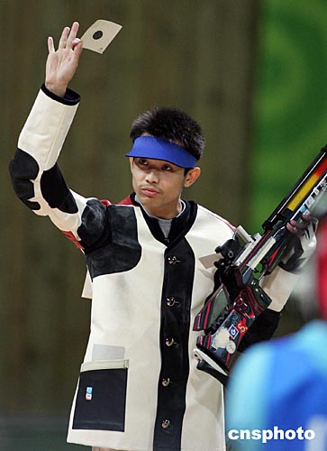 當?shù)貢r間八月十六日,中國選手朱啟南(左)與李杰在雅典奧運男子十米氣步槍射擊比賽中分獲金、銀牌。朱啟南并以七百零二環(huán)的成績打破世界紀錄。中新社記者:毛建軍