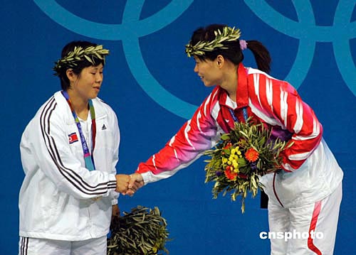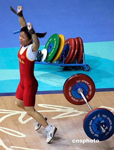 當(dāng)?shù)貢r間8月16日下午,中國女子舉重名將陳艷青在雅典奧運女子58公斤級舉重比賽中獲得冠軍,為中國代表團奪得第七枚金牌。作者:張煒