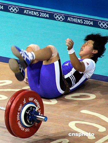 雅典當(dāng)?shù)貢r(shí)間8月16日下午,一名選手在奧運(yùn)女子58公斤級(jí)舉重比賽中失利。中新社記者:張煒