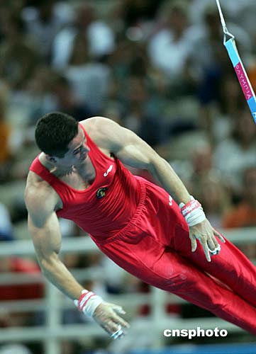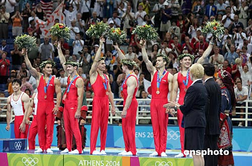 當地時間八月十六日晚,雅典奧運男子體操團體比賽在奧運體操比賽館舉行,羅馬尼亞隊獲得銅牌。中新社記者:毛建軍