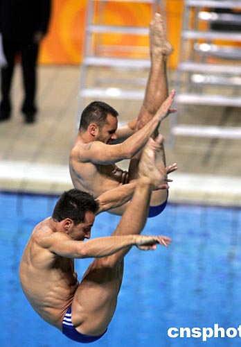當(dāng)?shù)貢r(shí)間8月16日晚,中國選手彭勃、王克楠在雅典奧運(yùn)會男子10米跳臺雙人決賽最后一跳中出現(xiàn)重大失誤,而希臘選手則將古代神話再現(xiàn)奇跡般獲得冠軍。中新社記者:任晨鳴