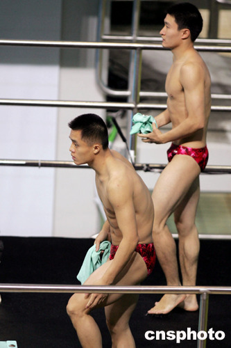 當?shù)貢r間8月16日晚雅典奧運會男子10米跳臺雙人決賽,本來領(lǐng)先的中國選手彭勃(前)、王克楠因在最后一跳出現(xiàn)重大失誤而名落孫山。中新社記者:任晨鳴
