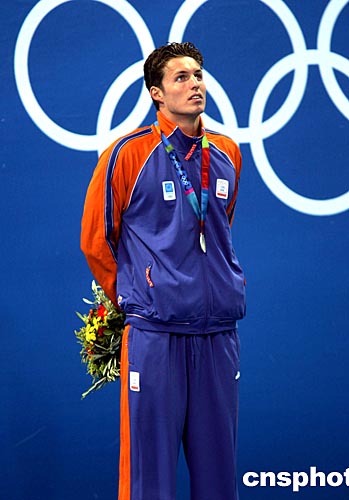 當(dāng)?shù)貢r間8月16日晚,荷蘭的游泳超級世界明星霍根班德,在雅典奧運會男子100米自由泳決賽中獲得亞軍。中新社記者:任晨鳴