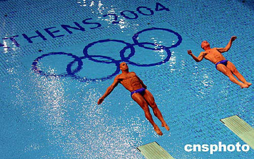 當(dāng)?shù)貢r間8月16日晚在雅典奧運(yùn)會跳水館,世界各國選手為實(shí)現(xiàn)各自的奧運(yùn)夢想而從十米跳臺縱身躍入湛藍(lán)的碧波之中。中新社記者:任晨鳴