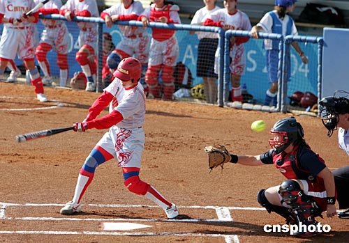 當(dāng)?shù)貢r間八月十七日,中國女子壘球隊(白)在雅典奧運會出場迎戰(zhàn)實力強勁的美國隊,一開場就有三名擊球手被封殺出局,最后以0:4失利。中新社記者:任晨鳴