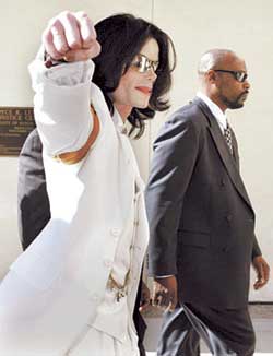 杰克遜這次身著的三件套裝全部為白色,另外他還戴了一個金色的袖標以及腳蹬一雙亮閃閃的白色靴子。他乘坐一輛金色的加長房車抵達法庭門口,下車時受到了100多個大聲尖叫的歌迷的歡迎。