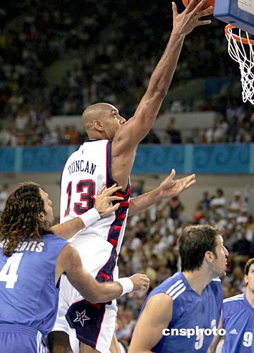 當(dāng)?shù)貢r(shí)間8月17日晚,東道主希臘隊(duì)在雅典奧運(yùn)會(huì)籃球比賽中竭盡全力與美國(guó)“夢(mèng)六隊(duì)”展開激戰(zhàn),幾乎讓不可一世的美國(guó)隊(duì)再遭敗績(jī)。中新社記者:任晨鳴
