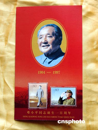 北京市郵票公司為紀(jì)念鄧小平誕辰100周年,并配合國家郵政局在2004年8月22日發(fā)行《鄧小平同志誕生一百周年》紀(jì)念郵票(1套2枚,小型張1枚),特設(shè)計(jì)印制了這套郵票的首日封、小型張首日封、郵折等郵品,將在8月22日與郵票同時(shí)發(fā)行。兩枚郵票的名稱分別為:中共中央總書記、中共中央軍委主席,面值均為80分。小型張圖案名稱為:改革開放和現(xiàn)代化建設(shè)總設(shè)計(jì)師,面值6元。中新社記者:鄒憲