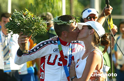 當(dāng)?shù)貢r間8月18日,美國自行車選手漢密爾頓在獲得奧運冠軍后,妻子獻上一吻以示獎勵。