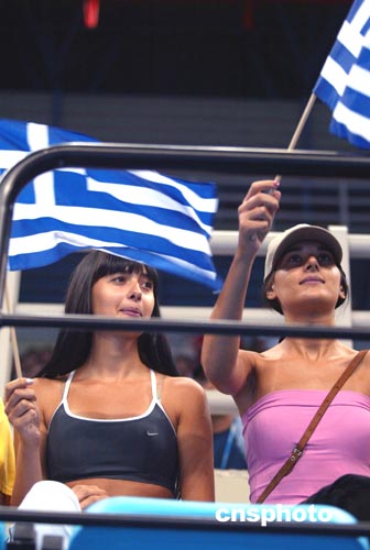 當(dāng)?shù)貢r間8月18日,男子柔道90公斤級比賽場邊,兩個漂亮的觀眾不停揮舞著希臘國旗助威加油。