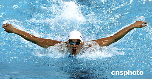 圖為法國選手Aurore Mongel在18日舉行的200米蝶泳的半決賽中如蝴蝶飛起模樣。