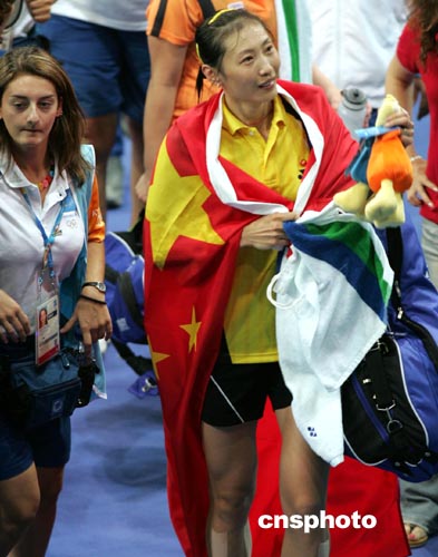 張寧獲勝后扔掉球拍,撲到場外和總教練李永波、女單教練唐學華緊緊地抱在一起,近幾天頗為郁悶的李永波臉上終于重現(xiàn)笑容。