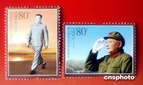 為紀(jì)念鄧小平誕辰100周年,中國國家郵政局將于2004年8月22日發(fā)行《鄧小平同志誕生一百周年》紀(jì)念郵票1套2枚,小型張1枚。兩枚郵票的名稱分別為:中共中央總書記(左)、中共中央軍委主席(右),面值均為人民幣80分。小型張圖案名稱為:改革開放和現(xiàn)代化建設(shè)總設(shè)計(jì)師,面值人民幣6元。中新社記者:鄒憲
