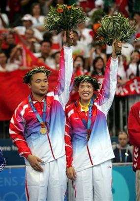中新社雅典八月十九日電 中國雅典奧運(yùn)羽毛球隊(duì)今天一掃前兩日男單、男雙盡墨的陰霾。繼張寧摘取女單桂冠后,悉尼奧運(yùn)冠軍張軍/高崚又衛(wèi)冕成功。在剛剛結(jié)束的混雙決賽中他們以二比一的總比分戰(zhàn)勝了來自英國的羅伯遜/埃姆,三局比分分別為十五比一、十二比十五和十五比十二。