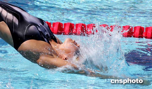 圖為當(dāng)?shù)貢r(shí)間8月19日女子兩百米仰泳比賽中德國選手Antje越入泳池的場(chǎng)景。
