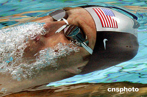 圖為美國(guó)選手Aaron Peirson在男子200米仰泳比賽中被捕捉到的一個(gè)鏡頭。