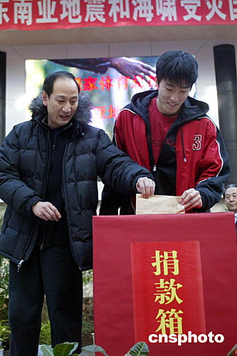 一月五日,中國(guó)國(guó)家體育總局各部門領(lǐng)導(dǎo)、職員以及各個(gè)項(xiàng)目運(yùn)動(dòng)員代表在北京國(guó)家體育總局舉行向東南亞受災(zāi)國(guó)家人民捐款活動(dòng),在奧運(yùn)會(huì)獲得一百一十米欄冠軍的劉翔(右)和他的教練孫海平在捐款箱前捐款。中新社記者:盛佳鵬