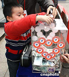 一月五日,重慶市民紛紛慷慨解囊為印度洋地震海嘯災(zāi)區(qū)捐款,獻(xiàn)上自己的愛心。圖為一名小男孩踮起腳在募捐箱中投入自己的零用錢。作者:郭晉嘉