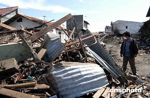 為中新社記者在印度尼西亞班達(dá)亞齊擔(dān)任向?qū)У陌噙_(dá)亞齊人阿順,1月9日在災(zāi)區(qū)路邊找到了他母親的遺體。阿順的母親在十五天前發(fā)生的印度洋大地震及其引發(fā)的海嘯中失去了生命。圖為他望著成為廢墟的家園,一臉惆悵。作者:禾木